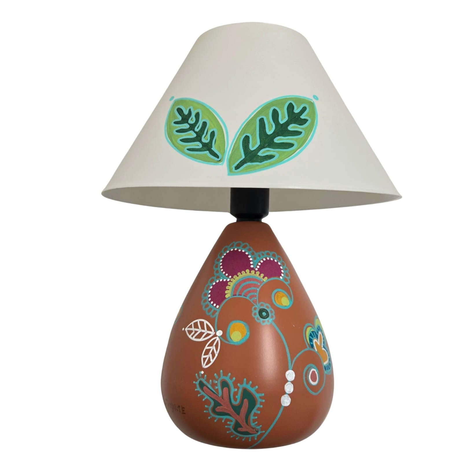 Abajur em cerâmica com pintura artística feita á mão, assinada pela artista Leila Duarte.