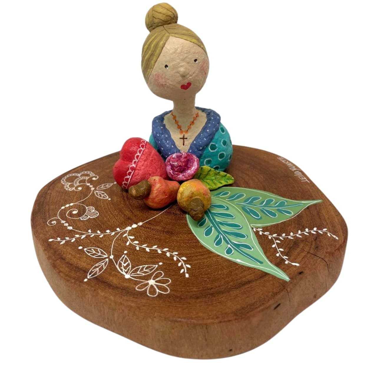 Escultura em papel machê sobre base de madeira assinada pela artista Leila Duarte.