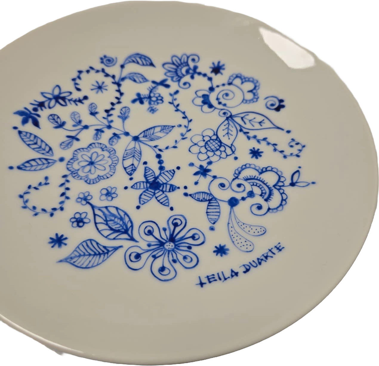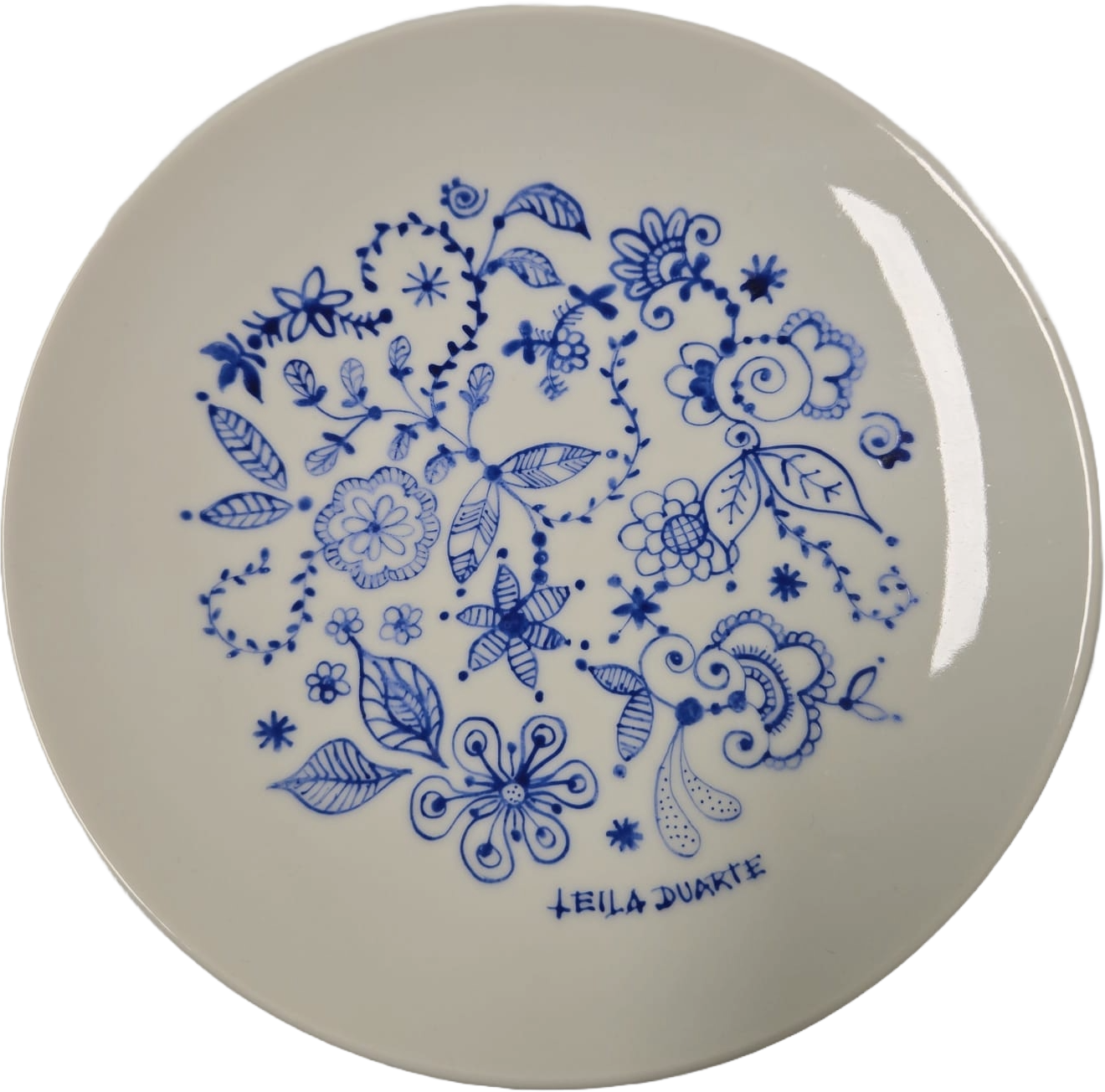 Prato de sobremesa em porcelana pintado à mão, assinado pela artista Leila Duarte