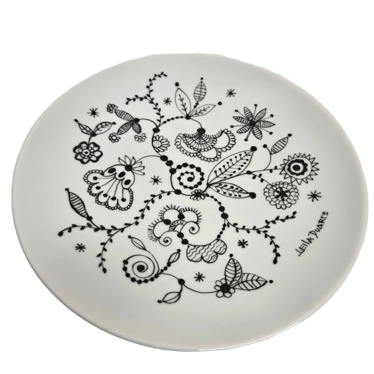 Prato de sobremesa em porcelana pintado à mão, assinado pela artista Leila Duarte.